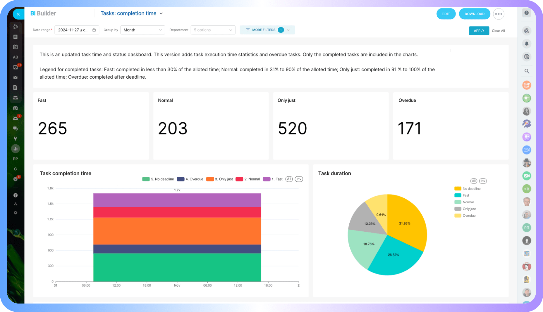 New dashboards are now available in BI Builder: create reports on employee efficiency and involvement in tasks. Plus, you can now upload your own data in the format CSV to BI Builder.
