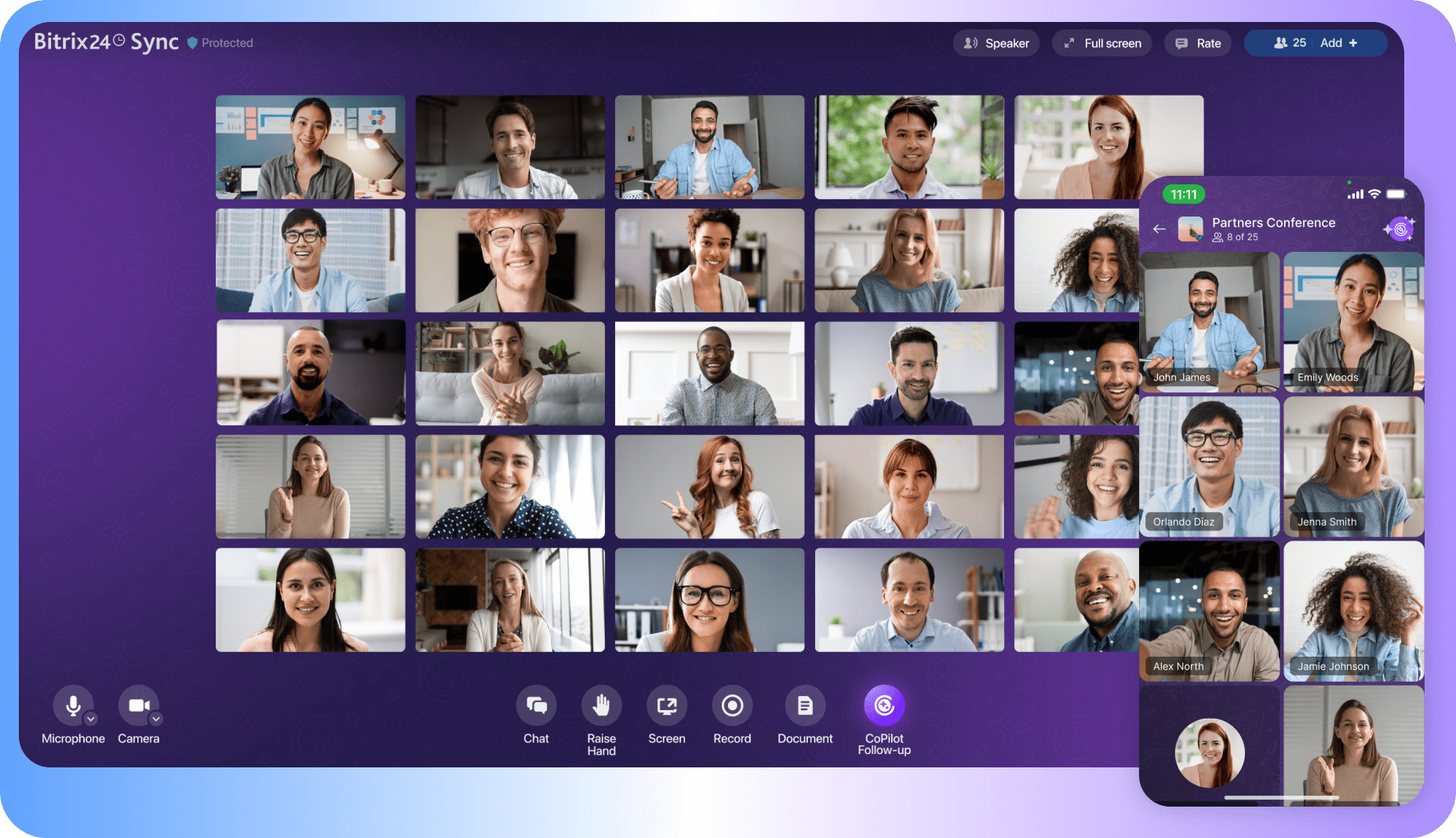 With the improved performance, our Bitrix24 Sync allows you to have up to 1,000 participants on a single while maintaining high quality picture, especially during screen sharing.
